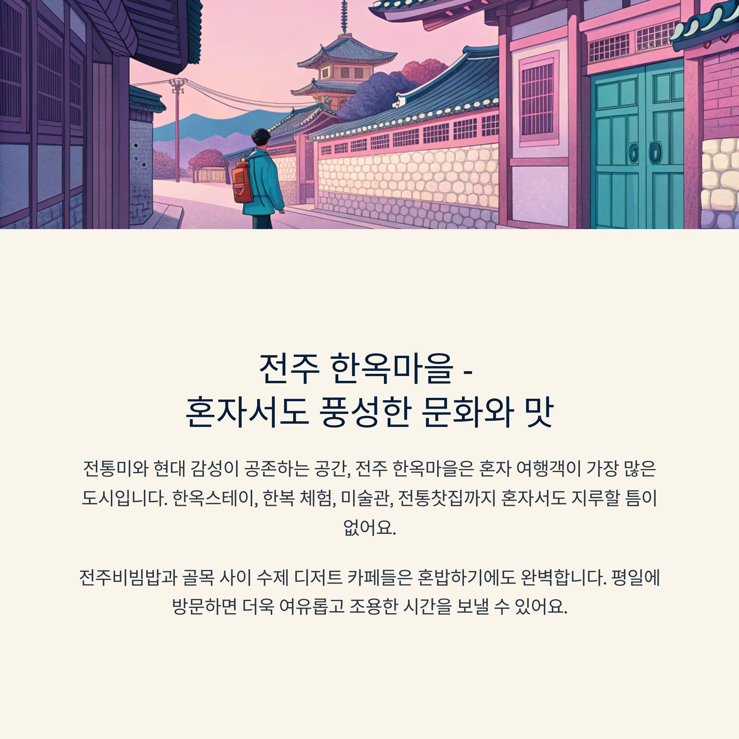 전주는 혼자 여행객이 많은 도시로, 한옥마을은 전통미와 현대 감성이 공존하는 공간입니다.